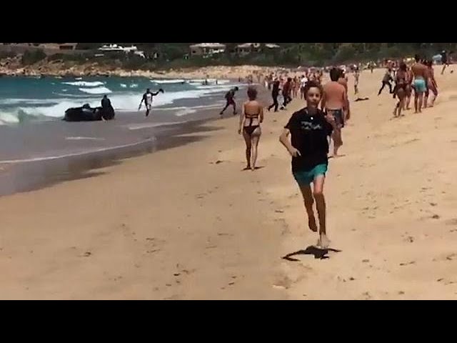 Holiday makers watch as the migrants scramble to reach the shore, jump out and run across the beach.